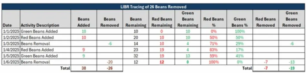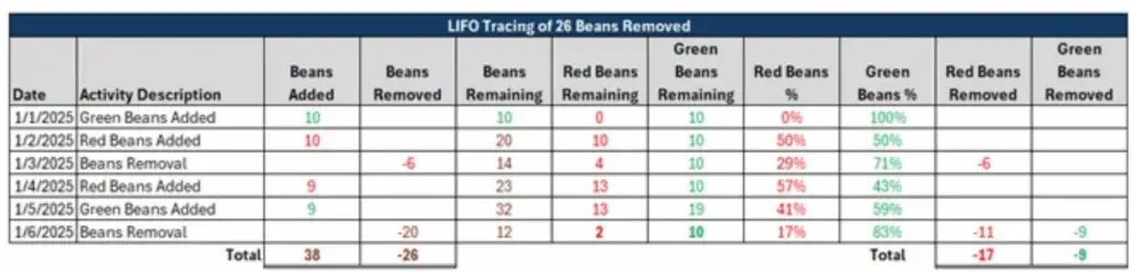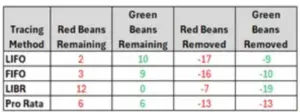 The green and red beans fact pattern leveraged for the above examples resulted in the least remaining and most removed red beans under the LIFO method and the most remaining and least removed red beans under the LIBR method. The summary results are shown in the chart below.