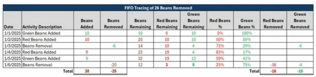 For the below FIFO example, you will see the first addition of beans being 10 green beans. Since those are the first beans added, the first beans removed are all green beans. It is not until those first 10 green beans are removed on January 6 that all of the red beans added on January 2 and some added on the 14th are removed.