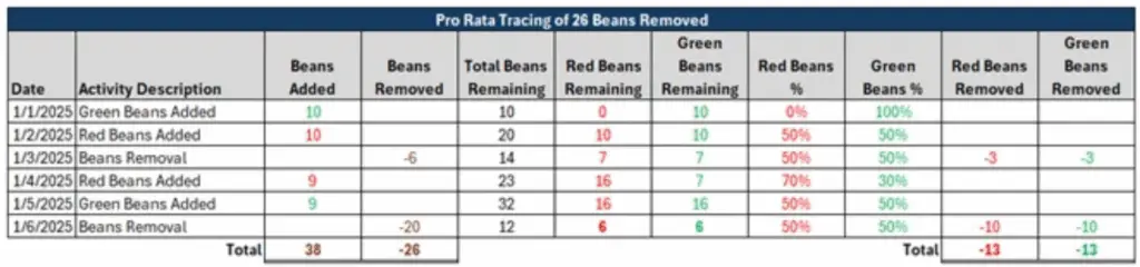 For this Pro Rata Distribution example, you will see there are an equal number of red and green beans when the first removal of six beans occurs, making those six beans half red and half green. Then, the removal of 20 beans on January 6 occurred when the proportion of red and green beans were equal again, so the beans were equally removed between red and green again.